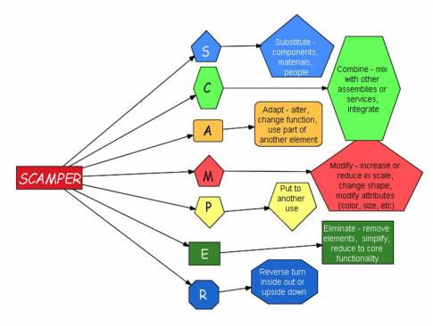 SCAMPER方法包括了7个切入点——Substitute(替代),Combine(合并),Adapt(改造),Modify(调整),Put to other uses(改变用途),Eliminate(去除),Reverse(反向)。SCAMPER是这一系列行动的首字母缩写,代表七种改进或改变的方向,通过这7点有助于检验是否有更好的改进现状的新想法。