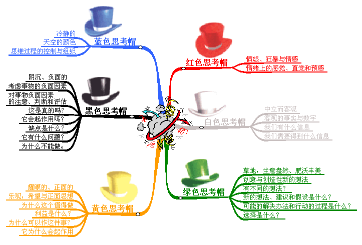 白色思考帽:白色是中立而客观的,代表信息、事实和数据;努力发现信息和增强信息基础是思维的关键部分;使用白帽思维时将注意力集中在平行地排列信息上,要牢记三个问题:我们现在有什么信息?我们还需要什么信息?我们怎么得到所需要的信息?这些信息的种类包括确凿的事实、需要验证的问题,也包括坊间的传闻以及个人的观点等等。如果出现了意见不一致的情况,可以简单地将不同的观点平行排列在一起。如果说这个有冲突的问题尤其重要,也可以在稍后对它进行检验。